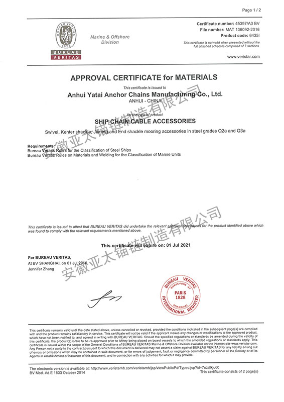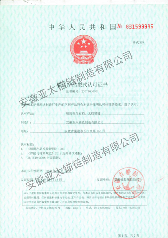 安徽亞太錨鏈制造有限公司是國家高新技術企業,也是國家GB/T 549-2017《電焊錨鏈》標準的起草和制定單位之一。公司旗下設有錨鏈分廠、浮標分廠、舾裝件分廠等多個分廠。公司專業從事φ12.5mm-φ107mm二、三級船用錨鏈、浮標錨鏈、錨鏈附件,錨、船舶曬裝產品、航標、系船浮、船型標、多種規格海洋監測浮標及航標燈等產品的生產、安裝和服務。目前公司的產品銷往全國各地船廠、碼頭、航標處、航道局、海洋局,并已走上國際市場,如東南亞、中東、歐美等國家。